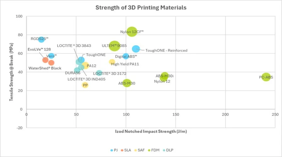 This chart also only shows tensile strength, impact strength, and heat deflection temperature of these materials. There are several other ways to measure material strength and toughness.