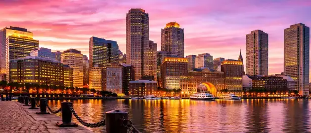 Baltimore Maryland skyline at sunset overlooking Inner Harbor marina, representing Stratasys Direct 3D printing and manufacturing services in Maryland.